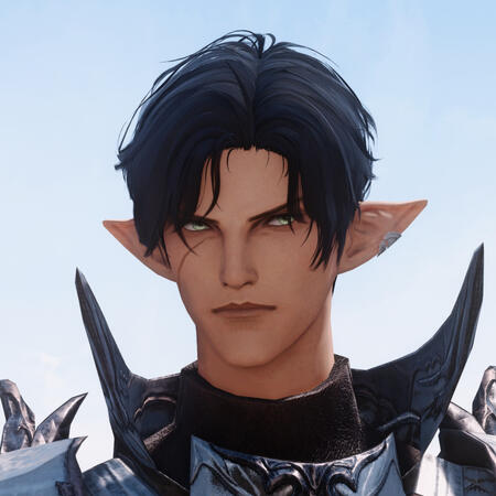 Tall and athletic, Lucien is a sun-kissed Elezen with soft viridescent eyes. In contrast to his gentle green eyes, Lucien bears a slimmer and sharper face, hawkish in appearance. Raven-black hair crowns the Elezen, complimenting his sharper features. Often cut short, the Dragoon leaves just enough length to part or sweep his obsidian hair to his liking. Notably, a scar lines Lucien's right cheek, an angled streak beginning just below his eye, tapering down to the tip of his jaw.
